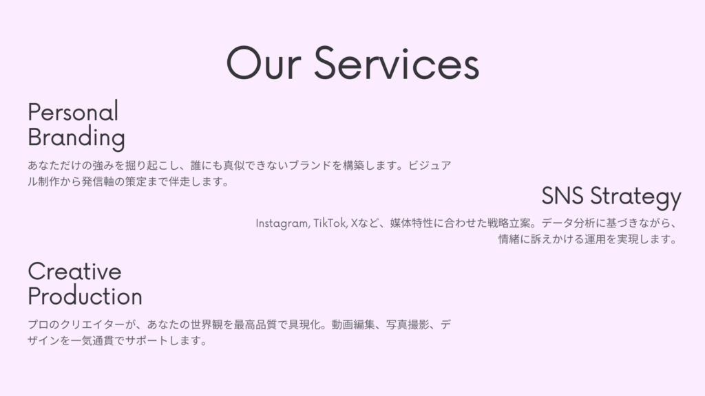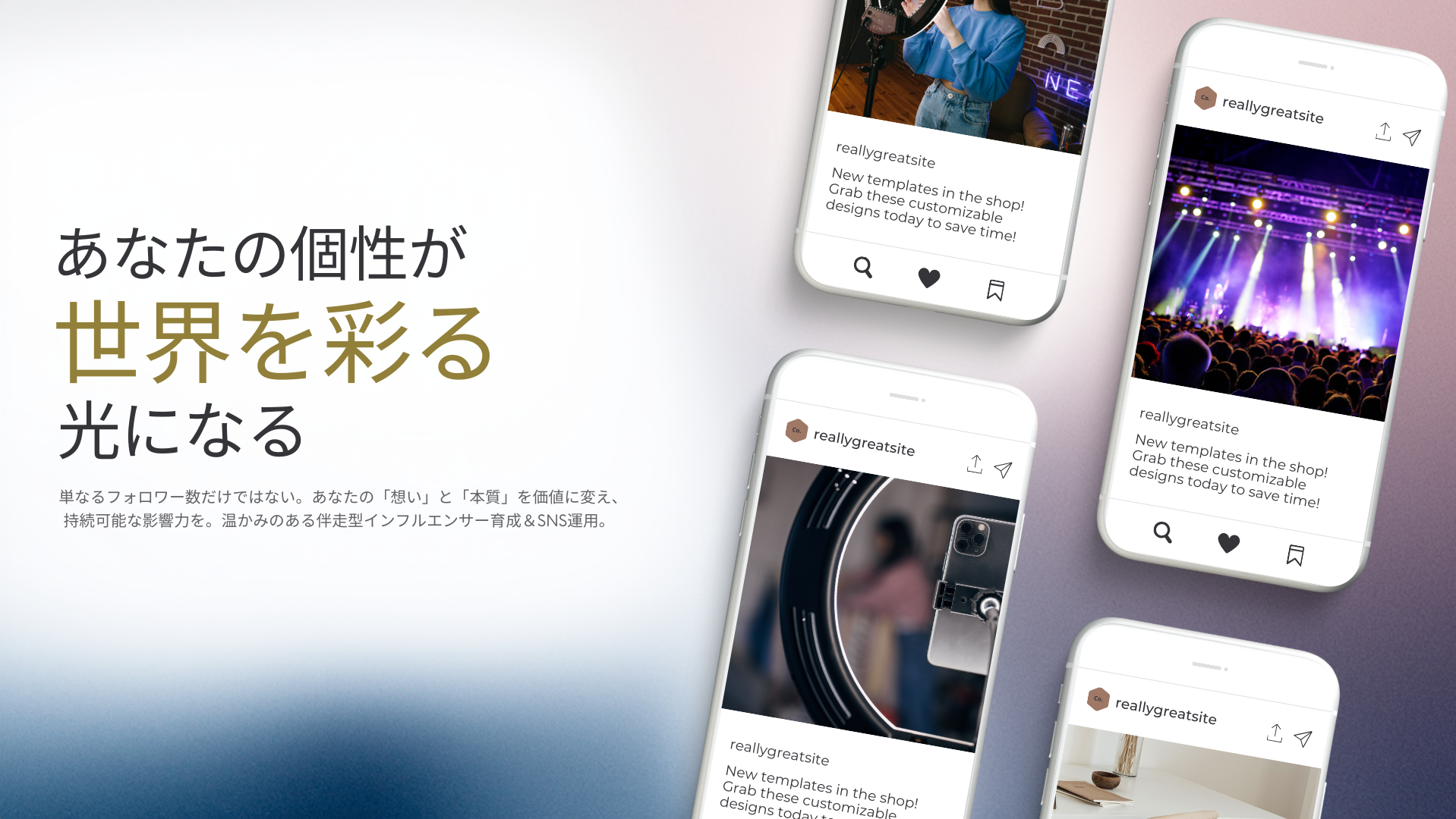 「自分らしさ」が、最高のコンテンツになる。 私たちは、単なるノウハウの提供者ではありません。あなたの人生の物語、価値観、情熱。 それらを磨き上げ、世界中の人々に届く形にする「職人」です。 最先端の思考と営業力でフォロワー数を至高の数値へ。